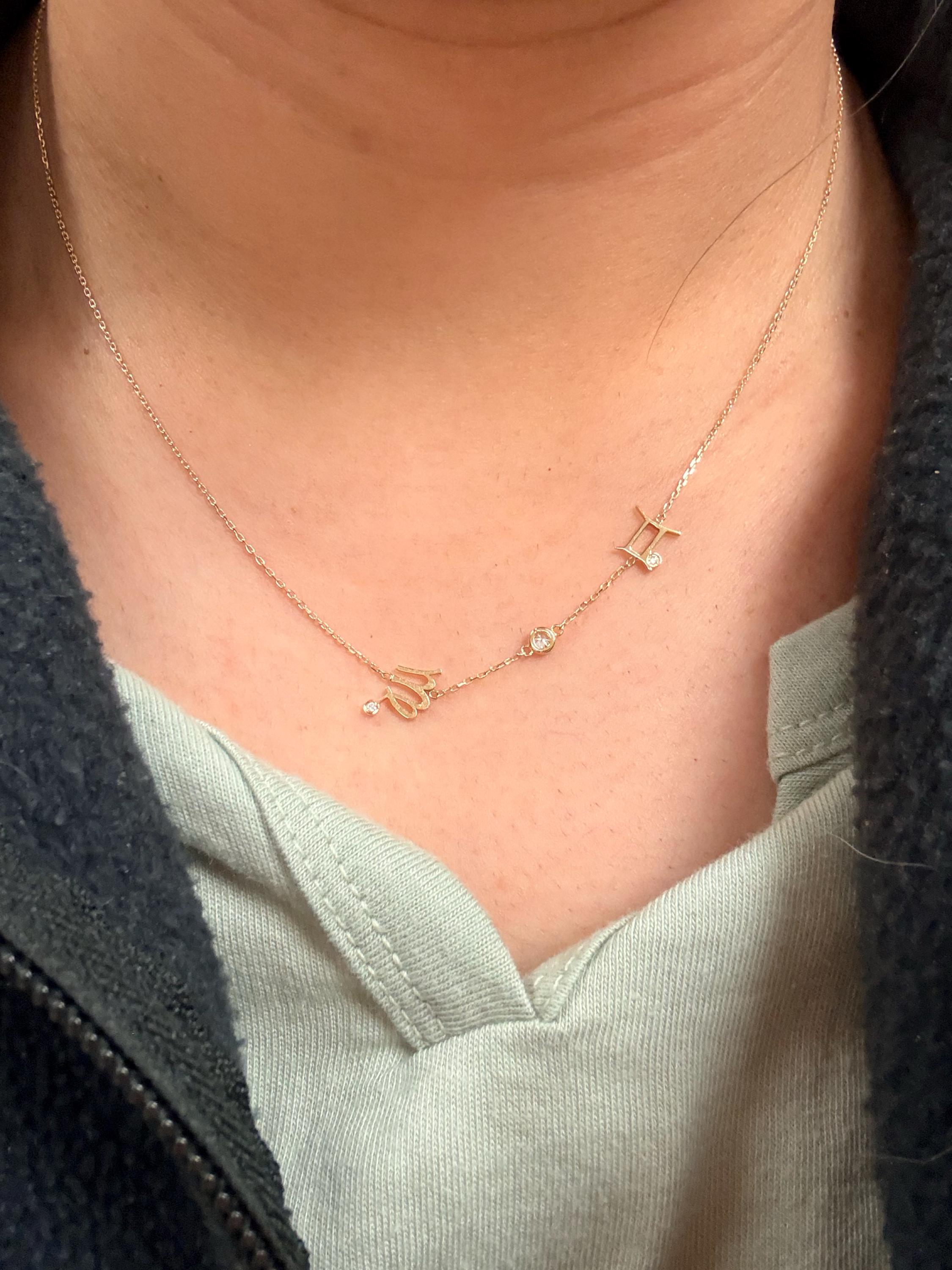 Sideways Zodiac Necklace, Double Zodiac Signs with Diamond Bezel Necklace, 14K Gold Zodiac Sign Diamond Necklace, Horoscope Diamond Necklace